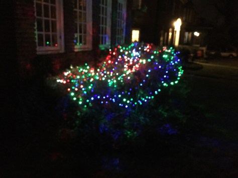 The bushes on the street side are easy to light. These are LED strings. Controlled by a photo cell that turns the lights on at dusk and off six hours later.
