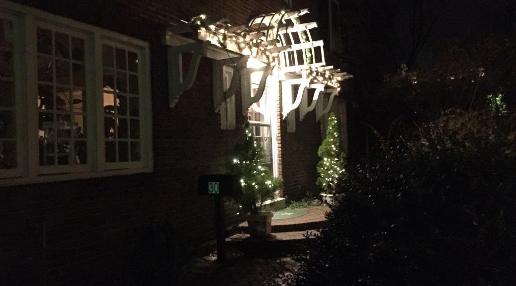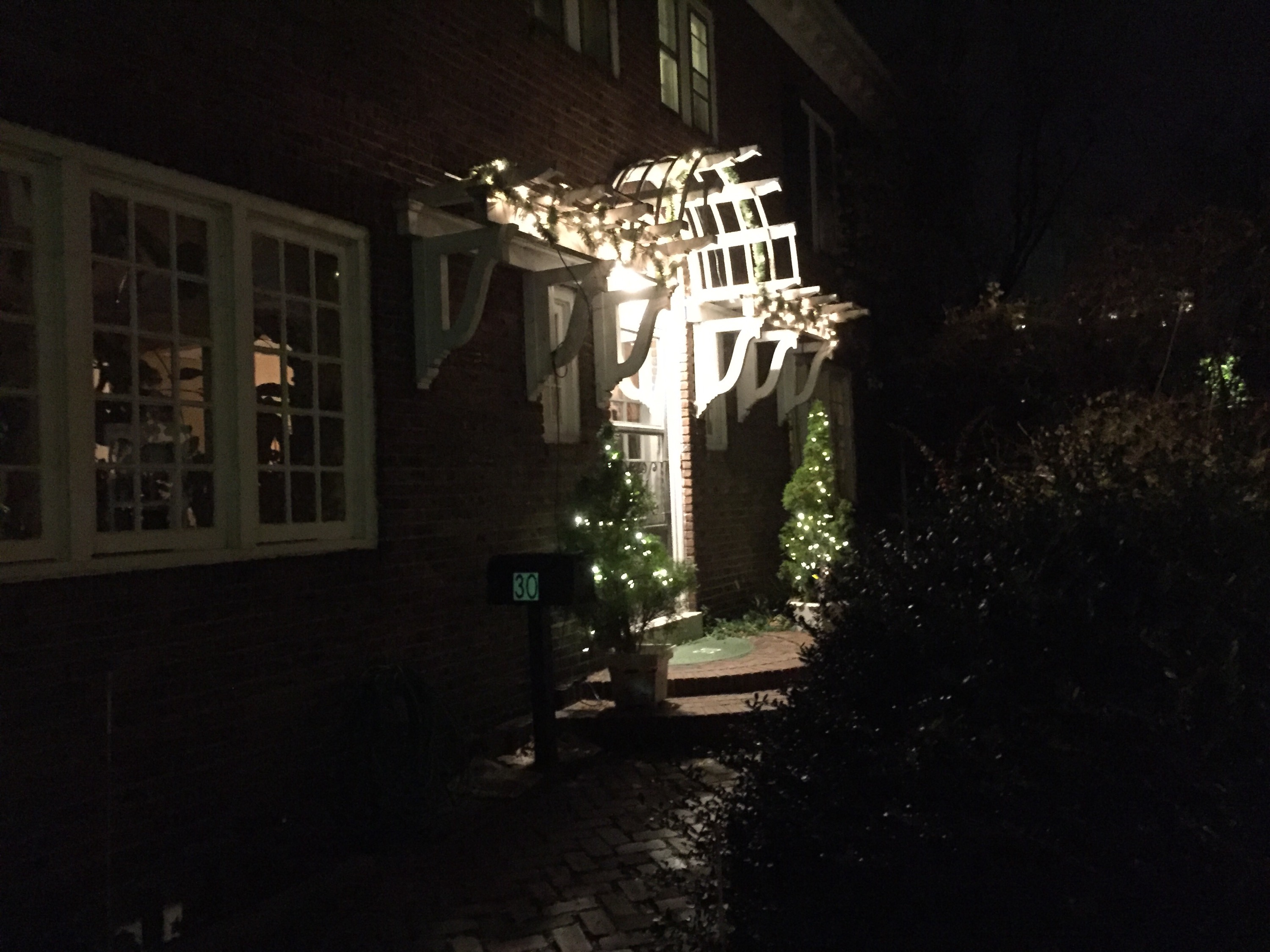 Garland lights on the trellis take the most time because of the ladder work. Controlled by a mechanical timer.